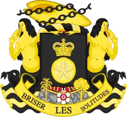 Crest: A sea shell Or entoured by a chain its ends broken Sable. Supporters: Two Simbis Or queued and crined Sable each sounding a sea shell Or and issuant from barry wavy Or and Sable set before a rocky mound proper growing thereon to the dexter a palm tree and to the sinister a pine tree Or. Motto: Briser les solitudes (Breaking down solitudes)[32] |