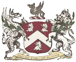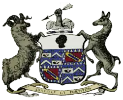 Crest: A wyvern, wings elevated, sable. Coronet: That of a Viscount Supporters: Dexter, a dragon; sinister, a lion, both argent, and holding in the fore paw a branch of laurel, resting on the shoulder, vert, fructed, gules. Motto: Fortiter Fideliter Feliciter (Boldly, faithfully, successfully)[6][1] |