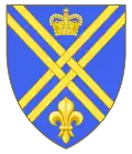 Escutcheon: Azure four bendlets interlaced in saltire between in chief a representation of the Royal Crown of England and in base a Fleur de Lis Or.
