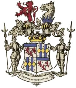 Crest: Out of a ducal coronet Azure, three arrows, points downward, one in pale and two in saltire, entwined at the intersection by a snake Proper. Coronet: That of an Earl Supporters: Two lions reguardant proper. Motto: Pro rege lege grege (For the king, the law and the people)[19] |