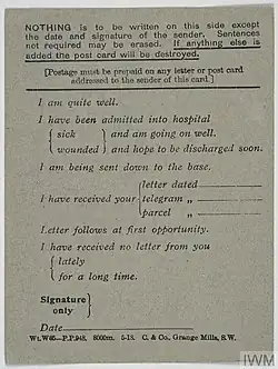 The unit also issued standard British Army forms and documents and printed in English, Flemish, French, Chinese and various Indian languages.[3][4] Some documents had a very wide distribution and huge production runs were necessary – such as for the field service postcards that were regularly issued to every man in the British and Indian Armies – while some manuals were highly specialised and print runs of only 500 were made.[12][11] Partridge's unit also undertook the printing of mess menus and Christmas cards.[17] The Army Printing and Stationery Service was also responsible for the manufacture and issuing of the rubber stamps used by mail censors.[11] From 1916 all documents produced by the unit were denoted with a SS (Stationery Service) reference code.[11] During a paper shortage in 1918 Partridge implemented a large scale paper recycling campaign.[17]