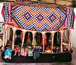 The broom exhibition is unique in showing the diversity and ecological linkages of common household objects. It is the largest exhibit of the museum. Kothari had initially thought of a museum based on the ecology of brooms. The brooms are exhibited in makka and bajra zones and different uses are showcased through the variation in their design and manufacturing material. The different types of grass of the desert are identified. The display recreates rural styles of tying a broom, some simply with whatever came in hand, some artistically with designer knots, while some have colour or ghunghroo added to them. The exhibition also has an album of grass. There is also an exhibition brooms of shrine. A traditional shrine with doors, called Kawad in Rajasthan, is used for storage and display of manufacturing process and material of different types of brooms. The display was designed and curated by display artist Madan Meena.[9][13]