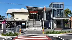 In preparation for quadruplication, the original footbridge and overhead booking office were demolished and replaced by a new footbridge in 1919. With construction of the new footbridge, the southern wing of the Platform 1/2 building was demolished. In 1923, the existing Platform 3/4 building was converted to an island platform. As such, the Platform 3/4 building underwent major alterations including new platform awnings constructed on both sides; floor levels raised; and new door and window openings and joinery. A 60-metre tunnel length existed to the south of the station, but was opened out and a bridge to carry Forest Road built in 1923.[5][6] A new larger timber overhead booking office was constructed in 1925, and the line through the station to Hurstville was electrified in 1926. The Arncliffe-Bexley tram line closed in 1926.[3]