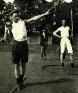 ![]() Arne Halse puts a shot at the Old Frogner Stadion in Oslo on 1–2 September 1906. |