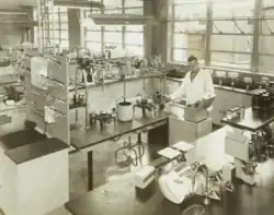 Development of the spectrophotometer also had direct relevance to the war effort. For example, the role of vitamins in health was being studied, and scientists wanted to identify Vitamin A-rich foods to keep soldiers healthy. Previous methods involved feeding rats for several weeks, then performing a biopsy to estimate Vitamin A levels. The DU spectrophotometer yielded better results in a matter of minutes.[13] The DU spectrophotometer was also an important tool for scientists studying and producing the new wonder drug penicillin.[14] By the end of the war, American pharmaceutical companies were producing 650 billion units of penicillin each month.[15] Much of the work done in this area during World War II was kept secret until after the war.[16]