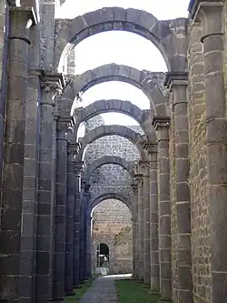 The large, roofless church lies to the north of the cloister. It was a three-aisled late Romanesque hall basilica built from Londorfer Basaltlava. Since the 19th century demolitions of the upper works, the roof and arches (except for an area in the northern side-aisle) have been gone. With the vestibule to the west and a cycle of eleven chapels at its eastern end the church in total measured over 85 meters in length. The transept was around 33 meters long whilst the nave was 24 meters wide. Estimates put the height of the central aisle at around 20 meters at the top of the arch. Stylistically, the church was most likely built between 1200 and 1250, starting with the eastern structures (choir and transept), followed by the first two bays of the nave (c. 1220) and then, after only a short break, the western bays.[29]