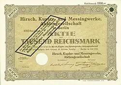 During the World War I, HKM profited due to German armaments orders but simultaneously lost money as their overseas raw material base was expropriated by Germany's war opponents. In the 1920s, Aron Hirsch & Sohn developed into a major European enterprise with holdings in around 50 companies in Germany and abroad. The headquarters were moved from Halberstadt to Berlin in 1927. With the global economic crisis starting in 1929, the company ran into economic difficulties. This led to the dissolution of the company in the early 1930s.[1] In 1929, the Imperial Chemical Industries (ICI) took over the firm's industrial activities and the trading house was subsumed by Handelshaus H. Schoyer.