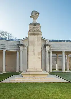 Architect Sir Edwin Lutyens (1869–1944), of the Imperial War Graves Commission, designed the layout of the Faubourg-d'Amiens Cemetery.[3] He also designed the Arras Memorial and the Arras Flying Services Memorial. The cemetery was planned and constructed before the two monuments were designed. As a result, the paths of the cemetery do not align with the Arras Memorial.[2] The Flying Services Memorial is adjacent to the Arras Memorial. It is an obelisk with a globe which forms a finial on the top. The four sides of the obelisk are inscribed with the names of 990 airmen who were killed on the Western Front and have no known grave.[1] Renowned Scottish sculptor Sir William Reid Dick (1879–1961) sculpted the globe with stars on top of the Arras Flying Services Memorial, as well as the badges on the monument.[4] The globe measures four-foot six inches in diameter, weighing almost three tons. At the 1932 unveiling ceremony, it was revealed that the position of the globe on the obelisk parallels that of the Earth on the morning of the Armistice, 11 November 1918.[5] The badges created by the Scottish sculptor are of the Royal Naval Air Service, the Royal Flying Corps, and the Royal Air Force, as well as the combined badges of Canada, Australia, New Zealand, and South Africa.[6]