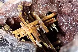 Yellow to yellow-greenish, transparent to opaque tabular and prismatic crystals, with perfect cleavage. Transparent to translucent. Hardness = ~2. Radioactive.[3]