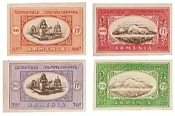 Following the creation of the First Republic of Armenia in 1918, the members of the country's Finance Ministry commissioned Fetvadjian to draw up the new currency (to replace the Russian ruble) and stamps for the nascent state.[4] The printing was conducted in Europe, and some of Fetvadjian's attractive designs featured animal motifs that were found on the decorations in Ani.[2] But just as the banknotes were being printed in Paris, Soviet Russia was completing its conquest of the republic and by December 1920, the Armenian state was finally absorbed by the Soviets. The banknotes were never put into circulation.[2]