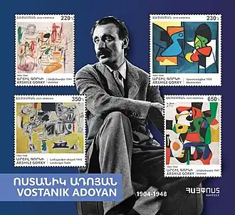 Arshile Gorky (/ˈɑːrʃiːl ˈɡɔːrki/ AR-sheel GOR-kee; born Vostanik Manoug Adoian, Armenian: Ոստանիկ Մանուկ Ատոյեան; April 15, 1904 – July 21, 1948) was an Armenian-American painter who had a seminal influence on Abstract Expressionism. He spent the last years of his life as a national of the United States.[1] Along with Mark Rothko, Jackson Pollock and Willem de Kooning, Gorky has been hailed as one of the most powerful American painters of the 20th century. The suffering and loss he experienced in the Armenian genocide had crucial influence on Gorky's development as an artist.