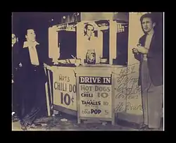 Art Elkind, a chemical engineer, turned to selling hot dogs when unable to find work during the Great Depression. Art's Famous Chili Dogs opened in 1939, about two miles west of its last location.[1] In 1944, it moved to its last location at Florence Avenue and Normandie Avenue. The first place at this intersection where Art had a stand was about 20 feet north of Florence, and on the east side of Normandie, in the 1950s he moved to the other location. Art Elkind claims to have invented the chili dog when he was selling hot dogs and chili from a pushcart when someone suggested that he combine the two (other hot dog vendors have disputed this legend). Art Elkind invented his own hot dog steamer, which kept all of hot dog's ingredients at the same temperature and for using a hot dog which was only part pork and had no natural casing, which contributed to his chili dogs' unique flavor.[2]