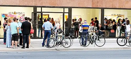 Galleries selling the work of recognized artists may occupy space in established commercial areas of a city. New styles in art have historically been attracted to the low rent of marginal neighborhoods. An artist colony existed in Greenwich Village as early as 1850, and the tenements built around Washington Square Park to house immigrants after the Civil War also attracted young artists and avant-garde art galleries.[17] The resulting gentrification prompted artists and galleries to move to the adjacent neighborhood "south of Houston" (SoHo) which became gentrified in turn.[18]