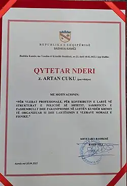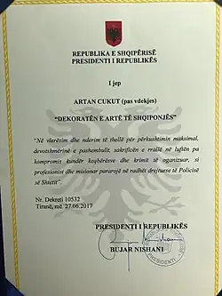 - ^ "Medalje nderi për ish-oficerin Artan Cuku". Republika e Shqipërisë, Ministria e Brendshme. 14 June 2017. Archived from the original on 24 January 2023. Retrieved 14 June 2017.