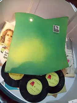 The original album cover is notorious for its unique "irregular trapezoid" shape,[53] featuring a green and yellow composition that alludes to a phrase written by Antonin Artaud in 1937, which can be read in the record's booklet: "Are not green and yellow each of the opposite colors of death, green for resurrection and yellow for decomposition and decay?"[15] A small photograph of the poet appears in its right upper angle.[96][97] Artaud's cover was based on a sketch by Spinetta and designed by Juan Gatti, a designer, photographer and plastic artist (who has later stood out for being the author of graphic designs related to Pedro Almodóvar's films), who also did the artwork of several other Argentine rock artists of the 1970s, such as Moris, Crucis, Pappo's Blues, Billy Bond y La Pesada del Rock and Roll and Sui Generis.[98][32] Gatti has said that the aim was to make "a disturbing and uncomfortable object, something that annoys", and has described it as a product of its time, when feelings of challenging the established were prevalent among the youth.[1] He also recalled in 2013: "The album I think was more a conclusion of Luis that was super excited with Artaud and before the record we were already talking about him and other French poets. So it was normal for that record to come out. [...] We were in the present and what really interested us was having fun. Perhaps of all of us it was Luis who had the most cultural and perishable pretensions.[98]
