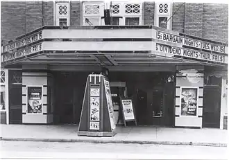 The Rembusch family from Shelbyville, Indiana leased the Artcraft in 1928 and bought the theater in 1936. The Rembusch family installed sound at the Artcraft on October 28, 1929. The first talkie was Fox's Follies of 1929.[4] In 1935 they added the first air-conditioning system in Franklin using a swamp cooling system.[5][6] During the Great Depression, many American families turned to cheap entertainment at the movies to keep a sense of normality. The Artcraft joined the popular Cash or Bank Nite lottery.[7] Bank Nite continued at the Artcraft through the 1950s. The Rembusches added a 2 line A-framed marquee and blade sign in 1940. They added walnut and agate-colored vitrolite glass on the lower front façade around the poster cases. Because of Franklin's idyllic community and its appearance of recovery from the Great Depression, LIFE Magazine chose Franklin as the feature for its photo-essay on a small town's Saturday night. The issue was photographed in October 1940.[8] written by Bernard Hoffman, and published in the December 1940 edition.[9]