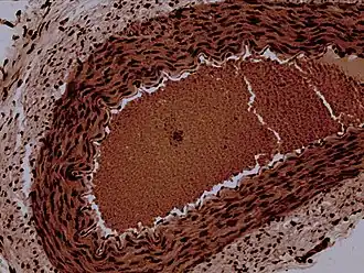 Blood pressure in the arteries supplying the body is a result of the work needed to pump the cardiac output (the flow of blood pumped by the heart) through the vascular resistance, sometimes termed total peripheral resistance. An increase in the tunica media to luminal diameter ratio has been observed in hypertensive arterioles (arteriolosclerosis) as the vascular wall thickens and/or luminal diameter decreases.