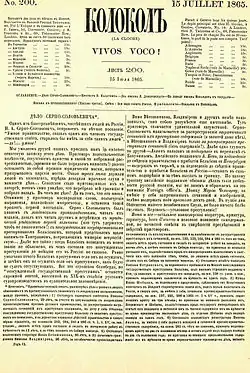 In the Russian capital Benni was befriended by a group of radicals (Nikolai Kurochkin, Pavel Yakushkin, Andrei Nichiporenko and others) who started referring to him as 'a Hertzen's envoy' (something Benni had never claimed to be) and instilling into him the idea that "everything was ready in Russia for a revolt." Unimpressed, Benni demanded a demonstration of "the revolutionary forces," but only five people came up, some by foot "others by cabs so as to make retreat easier, just in case," as Leskov put it.[6] Disillusioned with the 'revolutionary situation' in Saint Petersburgh, Benni with Nichiporenko, the Kolokol edition with them, embarked upon a trip to the province. Due to the latter's obnoxiousness, though, the pair has been thrown out of every house they tried to stay in, following their recommendation list. Finally, the two fell afoul of the local Cossacks and, after visiting the police, burnt their stack of Kolokol. As Benni was trying to leave his troublesome companion behind, the latter retaliated: he returned to Saint Petersburg with the theory of Benni being an "English spy," backing his allegations by the stories of his "suspicious behaviour" which involved, among other things, refusing to participate in drunken sprees and sex orgies, and defending the local "reactionaries" whom Nechiporenko has made a habit of insulting in their own homes. The idea was eagerly accepted by the Petersburg "revolutionaries", now embarrassed and frightened by Benni's eagerness.[6] Another project of Arthur Benni, that of collecting signatures under the Constitutional petition, addressed to the Tsar, failed too.[4]