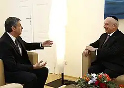 Rabbi Schneier has led 68 interfaith missions in China, Russia, Eastern Europe and Latin America. In 1992, he convened the Religious Summit on the Former Yugoslavia in Switzerland, and in 1995, he convened the Conflict Resolution Conference in Vienna to mobilize world religious leaders to stop the conflict in the Balkans.[12] For more than 20 years, Rabbi Schneier worked closely with Grand Mufti Ceric of Bosnia and Herzegovina. In 1992, they gathered together some of the top religious leaders from former Yugoslavia in Bern, Switzerland, including Cardinal Vinko Puljic, Archbishop of Sarajevo, formally of Zagreb, Patriarch Pavle of the Serbian Orthodox Church and Grand Mufti Jakub efendi Selimoski of Sarajevo to call for an end to the conflict. What emerged was Erklärung von Bern in which they declared that "a crime in the name of religion is the greatest crime against religion."[13] These efforts helped to forge a pathway to the Dayton Accord.[11] In 2012, Rabbi Schneier helped commemorate the Srebrenica massacre that occurred during the breakup of Yugoslavia by delivering the keynote address at the 17th annual Srebrenica memorial. He is thus far the only non-Muslim to do so. During his address, Rabbi Schneier delivered a message from U.S. president Barack Obama.[13]