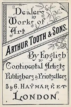 Tooth established the gallery for his son, Arthur Tooth (1828–1900).[1] The gallery remained in the Tooth family until its closure in the 1970s after the death of Dudley Tooth (Charles' great-grandson). Arthur Tooth & Sons, while a relatively small business, established a major presence in the commercial art market from the 1870s onwards.[2][3] The Tooth gallery supplied industrial magnate Henry Clay Frick with works by Lawrence Alma-Tadema,[4] Jean-François Raffaëlli,[5] J. M. W. Turner,[6] Frits Thaulow,[7] Pascal Dagnan-Bouveret,[8] and Rembrandt.[3][9]