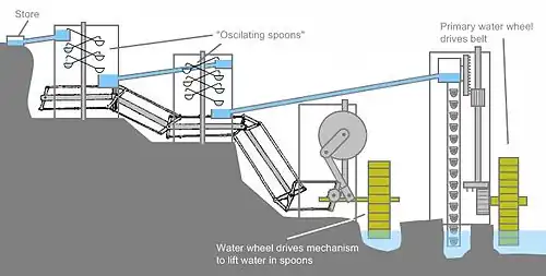 The details of the construction are the subject of debate, but the most widely accepted design is that proposed by Ladislao Reti, based on fragments of contemporary descriptions. A large water wheel powered a revolving belt with buckets or amphora that transported water to the top of a tower. When the buckets reached the top of the tower they would upend pouring the water into a small tank from where it would travel down to a smaller tower via a pipe. A second water wheel provided mechanical power to pumps that drove a series of cups mounted on arms inside the second tower. The arms of the cups were hollow with an opening at the end which allowed water to run down inside the arm and out of the opposite end. A see-sawing motion of the arms lifted the water to successive levels in the cups. Once the final level was reached the water flowed down a second pipe to a third tower which contained further cups on arms and was also activated by the mechanical power derived from the second water wheel. This final tower raised the water high enough to allow it to flow into the storage tanks at the Alcázar.
