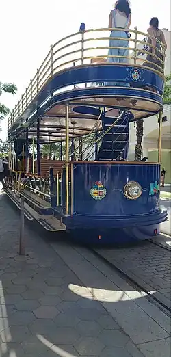 The Oranjestad Tram, also sometimes called Arutram, is tram line in Oranjestad, with its rolling stock being powered by hydrogen.[10] It was built as a key component of a larger project to upgrade the main retail areas of the town, other aspects of which included pedestrianization of streets, planting of trees, installation of ornamental street lighting and resurfacing of streets and sidewalks.[11] It runs from the Port of Call, the arrival and departure terminal for tourist ferries to Plaza Commercio. There are 8 regular service stops, with 2 additional stops in the Port of Call and on Waterweg. The depot is located west of Rancho. The line does a loop around commercial areas and the Renaissance mall.[12][13]