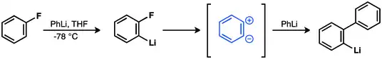 Wittig et al. invoked zwitterionic intermediate in the reaction of fluorobenzene and phenyllithium to give biphenyl.[41][42][43] This hypothesis was later confirmed.[44][45][46][47][48]