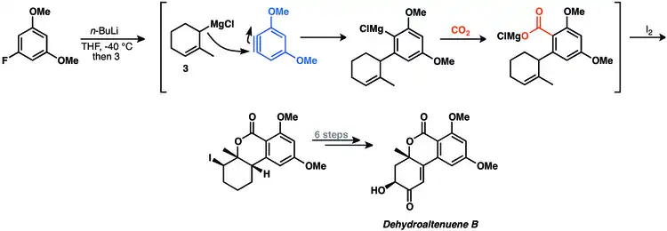 Multicomponent reactions of arynes are powerful transformations that allow for rapid formation of 1,2-disubstituted arenes. Despite their potential utility, examples of multicomponent aryne reactions in natural product synthesis are scarce.[14] A four-component aryne coupling reaction was employed in the synthesis of dehydroaltenuene B.[55]