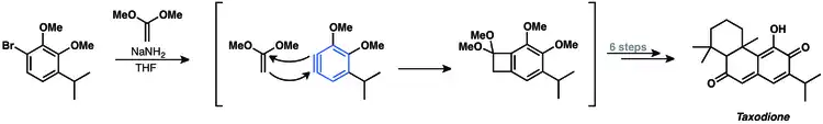 Due to significant byproduct formation, aryne [2+2] chemistry is rarely utilized in natural product total synthesis.[14] Nevertheless, several examples do exist. In 1982, Stevens and co-workers reported a synthesis of taxodione that utilized [2+2] cycloaddition between an aryne and a ketene acetal.[31]