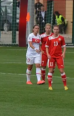 Finally, she made her debut in the Turkey women's national team in the UEFA Women's Euro 2013 qualifying – Group 2 match against the Romanian side on 23 November 2011.[3][33] She took part in the 2015 FIFA Women's World Cup qualification – UEFA Group 6 match first time against Montenegro on 28 November 2013.[34][35][36] She scored her team's honor goal in the match against the women from Wales that ended with 1–5.[37]