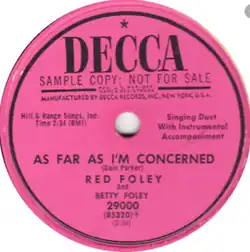 "As Far As I'm Concerned" is a song written by Dale Parker, performed by Red Foley and Betty Foley, and released on the Capitol label (catalog no. 21226). In March 1954, it peaked at No. 8 on the Billboard country and western chart.[1] It was also ranked No. 24 on Billboard's 1954 year-end country and western retail chart.[2]