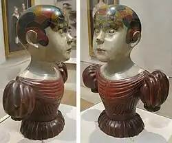 - Bust Portrait of a Young Man (Self-Portrait) - c. 1847 - 1851 - currently held in the collection of the Huntington Museum of Art, Huntington, West Virginia. This is almost certainly a self-portrait by Ames (based upon comparisons between the profiles of it, the bust carving depicted in the recently discovered daguerreotype and the image of Ames himself) or far less likely, a portrait of John Trowbridge Ames (1819 - 1902), the artist's brother. The daguerreotype was commented upon in 2015 at luminous-lint.com, a website devoted to 'Photography: History, Evolution and Analysis,' where the site noted: "Ames is shown sitting at the far left with a block of wood held between his knees. He is sculpting with a mallet and chisel, and a face is just beginning to emerge from the surrounding wood, a face eerily like his own: the artist carving a self-portrait."[17] The addition of the doubly elaborate drapery and two tied bows surrounding its base along with its delicately carved and painted features, indicates this particular bust, more than others, was meant to be a showpiece, conveying the artist's technical abilities. Like the daguerreotype, the bust's rather diminutive size (just over 14 inches tall), meant that it, too, could have been brought to the homes of prospective clients to see in person.[18] The unique circular, hollowed out space at the front of the sculpture, which may have been designed to hold the silver medal awarded to Ames at the New York State Fair in 1848, would have further impressed the artist's stature upon his potential clientele. The Huntington Museum acquired the carving in 1977 from Gene Harris Antiques Auction Center, located in Marshalltown, Iowa, not far from the town of Traer, Iowa, where John T. Ames, his family and Asa's widow, Emma, resided and were eventually buried (Buckingham Cemetery).[19] Illustrated in Jack T. Ericson's "Asa Ames: Sculptor" in the magazine Antiques (September 1982); Stacy C. Hollander's "Asa Ames and the Art of Phrenology" in The Clarion (Summer 1989); Stacy C. Hollander's Asa Ames: Occupation Sculpturing (New York: American Folk Art Museum, 2008).