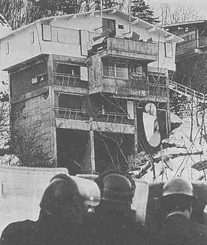 Sighting the police pursuit near Karuizawa on February 19, the five radicals took refuge in a vacation lodge called Asama Sansō (Asama Mountain Villa) owned by Kawai Musical Instruments Manufacturing. The radicals entered the lodge and discovered Yasuko Muta, the 31-year-old wife of the lodge's caretaker. She was the only person in the building, as her husband was walking the dog and the lodge's guests had gone ice skating. The radicals took Muta hostage at gunpoint and barricaded the building.[6]