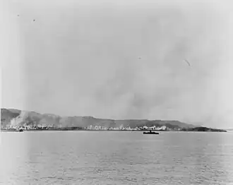 ![]() Bombardment of the Asan shore. Asan Point on right. Note LCI gunboat and three aircraft on bombing runs. | |