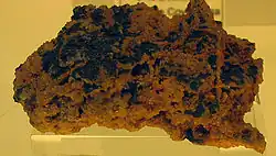 Asbolane, previously cobalt ochre[2]: 172 is a manganese (IV) oxy-hydroxide mineral containing also cobalt, nickel, magnesium, and calcium ions. It crystallizes in the hexagonal crystal system.[3] Its chemical formula is Mn4+(O,OH)2·(Co,Ni,Mg,Ca)x(OH)2x·nH2O.