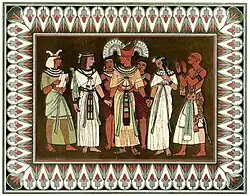 ![This image from a 1475 Flemish manuscript shows Aseneth asking for an angel's blessing for seven young women.[22] The image is likely inspired by an apocryphal text in which Aseneth, while being visited by an angel after converting from paganism, asks the angel to bless her seven slaves.[20]](./_assets_/Aseneth_Requesting_the_Angel's_Blessing_of_Seven_Young_Women.png)