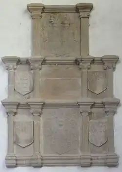 A late 16th century[20] stone heraldic mural monument of Richard Bellew of Ash survives in Braunton Church, on the south aisle wall. It is said to have been taken from the former chapel at Ash.[21] It is a triptych split by use of superimposed orders of short Ionic columns into three rows and seven compartments. Within six of the compartments are escutcheons with heraldry sculpted in relief. The painted inscription and all painted colouring have been lost. It shows Richard's own shield at bottom centre, that of his father at top and on both sides in total 4 further shields of his father (again), grandfather, great-grandfather and great-great-grandfather.