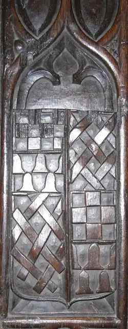 Arms of Fleming quartering Bellew, bench-end, St. Branock's Church, Braunton