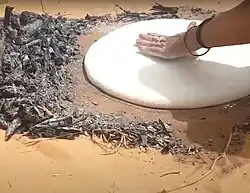 In northern Yemen, ash cakes were called jamrī (جَمْرِي), typically made thick, and baked directly over coals kept in a special vessel made of basalt-stone.[3] In some places, ashes are spread over the face of the dough before being embedded entirely within the hot coals. Bedouins in Yemen would not embed the dough within hot coals, but rather stick the dough on the backside of an iron skillet, and fill the hollow space of the skillet with hot coals. In Arabia, ash cake is served with a treacle of date syrup (dibs) and with clarified butter (samne).