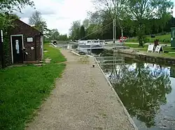 The Order allows Leicestershire County Council to purchase land and construct 2+1⁄2 miles (4 km) of canal from Snarestone to Measham. Initially, this would follow the original route, but would diverge near Measham, to use the track of a redundant railway. The new canal would pass through Measham Station and cross the High Street on an aqueduct.[23] The Transport and Works Act Order was introduced by the British Parliament in 1992 as a way of simplifying the legal processes for railway and canal projects, and works which interfere with navigation rights.[24] Although a number of railway projects had previously been authorised under this legislation, the Ashby Canal Order obtained by Leicestershire County Council was the first time that construction of a canal had been authorised in this way.[25] Purchase of the land between Snarestone and Measham had been completed by 2010.[26] Re-construction of the first 100 yards (91 m) of the infilled section began on 26 February 2009, after a grant from the East Midlands Development Agency was secured. The £0.5 million project involved the provision of a stop lock, a new slipway, an improved winding hole and a wetland nature reserve, running parallel to the canal and connected to it.[27] The stop lock chamber marks the division between the part of the canal owned by the Canal & River Trust, and that owned by Leicestershire County Council,[28] although no gates have been fitted while the length of canal beyond the chamber is short.[29]