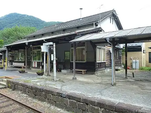 Ashio Station opened on 31 December 1912 as a station on the Ashio Railway.[1] In 2009, many of the structures of Ashio Station were granted protection as national Registered Tangible Cultural Properties. These include the station building and adjacent platform,[2] the opposing platform,[3] Baggage Storage Shed[4] Dangerous Goods Shed [5] and Freight Depot with freight platform.[6]