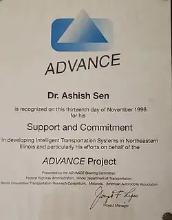 While at UIC, he wrote the proposal which resulted in the creation of the Urban Transportation Center. Sen became its director in 1996. He published extensively in statistics, transportation, urban planning, mathematics and geography journals and coauthored several widely circulated reports, including planning manuals for paratransit and transit. He also wrote two books: Regression Analysis: Theory, Methods and Applications (with M.S. Srivastava) and Gravity Models of Spatial Interaction Behavior (with Tony E. Smith). In the late 1980s, Sen worked on the ADVANCE project, a major research project on car navigation systems.[3][4]