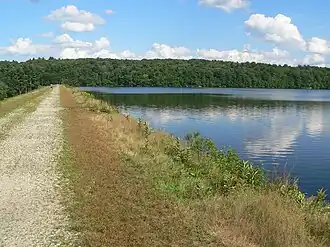 Ashland State Park is a public recreation area surrounding the 157-acre (64 ha) Ashland Reservoir in the town of Ashland, Massachusetts. The state park's 470 acres (190 ha) incorporate the entire shoreline of the reservoir, which is abutted by the Warren Conference Center and Inn[3] of Framingham State University, town-owned land once the site of Camp Winnetaska (a Girl Scouts camp),[4] and residential houses. The park is managed by the Massachusetts Department of Conservation and Recreation.[5]