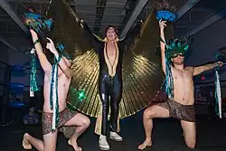 Castle's gimmick is that of a flamboyant showman with an androgynous personality, drawing comparisons to Gorgeous George,[12][153] Adrian Street, Ric Flair, and Goldust.[12][154] However, unlike those predecessors who have tended to portray villains, Castle typically plays a fan favorite. Castle has also mentioned glam rock stars David Bowie, Freddie Mercury, The Darkness, and Foxy Shazam as inspirations,[12] in addition to Lady Gaga.[155] Befitting the nickname of "The Power Peacock," he combines showmanship and flamboyance with strength and technical soundness, and has displayed an ability to suplex nearly any opponent, including Shane Taylor[156] and Samoa Joe[157]