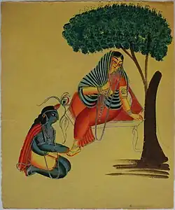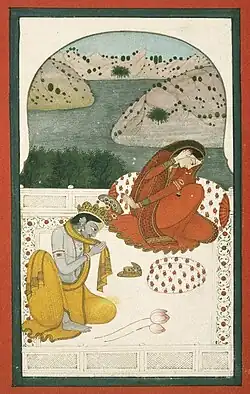 Svadhinabhartruka ("one having her husband in subjection")[2] or Svadhinapatika(as named by Keshavadasa) is the woman who is loved by her husband and controls him. He is subjugated by her intense love and pleasing qualities. He is devoted and faithful to her [3][6] In paintings, this nayika is depicted with a nayaka, who applies mahawar on her feet or a vermilion tilak (mark) on her forehead.[3] In Jayadeva's Gita Govinda as well as in the poem Kuru Yadunandana, Radha is portrayed as a Svadhinabhartruka. In the latter, Radha commands her lover, the god Krishna, to rearrange her makeup which is in disarray.[6]