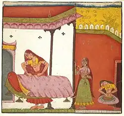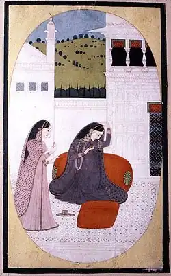 Virahotkanthita ("One distressed by separation")[2] or Utka (as described by Keshavadasa) is the distressed heroine pining for her lover, who, due to his preoccupation, fails to return home. She is depicted waiting for him, sitting or standing on a bed or out in the pavilion.[3]