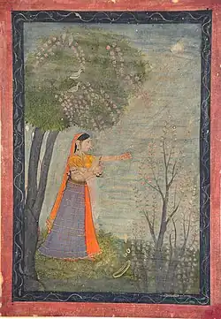 Abhisarika ("one who moves")[2] is a heroine, who sets aside her modesty and moves out of her home to secretly meet her lover.[6] She is depicted at the door of her house and on her way to the tryst, defying all kinds of difficulties like the storm, snakes and dangers of the forest.[3][6] In art, Abhisarika is portrayed often in hurry towards her destination.[6]