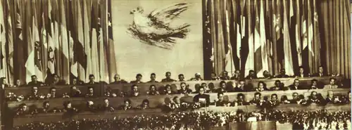 The gathering took place against the backdrop of the Korean War and the growing Cold War between the communist East and democratic West. It coincided with the heyday of positive Sino-Soviet relations. Delegates, mainly affiliated with domestic communist parties, traveled to Beijing from Canada, the United States, Guatemala, Colombia, Pakistan, India and Indonesia. Representatives from Australia attended the preliminary conference in Beijing in 1951, but proposed delegates for the 1952 conference had their passports revoked in an unprecedented Federal government intervention[1]. Resolutions were passed, including a signed declaration by the Pakistani and Indian delegates supporting a negotiated settlement to any differences and the resolution of the Kashmir question "by the people of the Kashmir."[2]