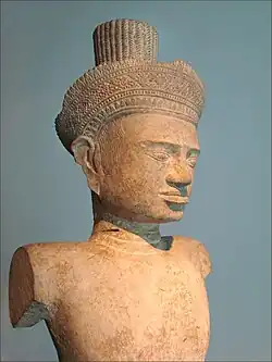 A statue of a male deity, made of sandstone, originating from Cambodia. It represents a deity, as shown by the diadem, an accessory reserved for gods and goddesses. This statue most likely represents the Hindu god Vishnu. The work was created in the early 12th century, under the reign of Suryavarman II. The eyes outlined with an incision extending toward the temples, the cylindrical bun hairstyle, and the costume are all markers of the “Angkor Wat style.”