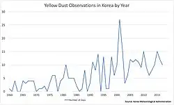 In the last half century, the number of days with reports of Asian dust has increased five-fold.[21] According to an analysis on data from Korea Meteorological Administration (KMA), the average number of days with Asian dust in a given year was about two in the 1960s. However, this number has increased to 11 in 2000s. In 1960s and 1970s, each decade had 3 years that were Asian-dust free. However, starting from 2000s, there has not been a single year without Asian dust.[21] In just four months of 2018, Gyeonggi Province of South Korea issued 42 dust warnings and advisories, which has increased from 36 in the same period in 2017.[12] This reflects the increase in average dust concentration level from 132.88 ppm (parts per million) in 2017 to 149 ppm in 2018. The situation is worsening since the dust particles are staying in the air longer. The average duration has increased from 16.3 hours to 19.8 hours in the last two years.[22]